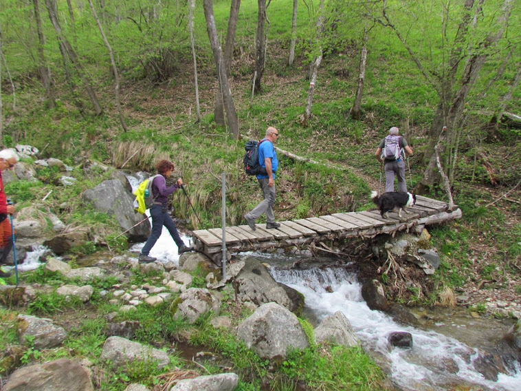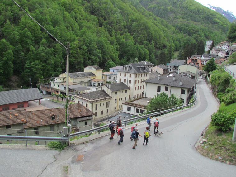 Parcheggiamo a Bognanco Fonti, 650, in una giornata per ora bellissima. Sulle cime più alte ancora tanta neve, più in basso il verde brillante che le recenti piogge hanno fatto “esplodere”. Nonostante le previsioni poco ottimistiche, riusciremo a pranzare all’aperto e a starcene al sole per tutto il giorno. Undici pensionati e tre signore compongono il gruppo. A produrre qualcosa per il nostro assegno mensile contribuisce solo la dottoressa. L’ormai matura Asia, Pastore Scozzese, fa la conoscenza di Sky, cucciolone e Pastore Australiano. Attraversiamo il paese e salutiamo il signor Mella, che ci sembra l’unico abitante. Risaliamo sulla strada in corrispondenza del pub pizzeria ex Croce Bianca ed imbocchiamo il Sentiero del Paese Cantato, che merita veramente di essere percorso anche dai miei amici che non lo conoscevano ancora. Arriviamo a Boco, dove un giro accurato ed una lunga pausa sono doverosi. Risaliamo a Bacinasco e a San Lorenzo, 980, con l’ennesima pausa dedicata ad un buon caffè. Lungo strada e mulattiera saliamo a Graniga, 1080. Fino a qui un’ora e un quarto di cammino effettivo, abbinato a quasi un’ora di deambulazione puramente turistica. Siamo in abbondante anticipo al ristorante, ma Paola e Cecilia non si lasciano cogliere dal panico e sfamano molto bene e in fretta i quattordici viandanti, affamati anche oggi nonostante le scarse calorie bruciate. Ci raggiunge a tavola anche un amico, pensionato lavoratore, assente da tempo dal gruppo per un infortunio a lunga degenza. La pausa pranzo si prolunga ben oltre le aspettative e, con il benestare della guida titolare, decido di prolungare un po’ il giro per bilanciare, almeno in parte, gli splendidi carboidrati, misti a proteine, assunti in quel di Graniga. Dal piazzale di fronte a Cecilia parte, in direzione nord, un sentiero ben segnato che si sviluppa al disotto della strada. Lo seguiamo, in fase di digestione, fino ad attraversare, su un ponticello di legno, il Rio Acquamorta e risalire rapidamente ad intersecare una pista sterrata a quota 1150, il punto più alto della gita di oggi. Teniamo la destra e la seguiamo in dolce discesa fino all’Alpe Croppo Sopra, 1058. Proseguiamo fino a Mulera San Giuseppe, 913, dove troviamo aperta la casa della Scuola Femminile Galletti del 1861 (un’ora e un quarto da Graniga). C’è il proprietario, il signor Franco, torinese di origini ossolane, che ce la fa gentilmente visitare. Per non farci mancare niente ci offre anche del buon Prosecco e noi, per ricambiare la sua squisita ospitalità, ne vuotiamo due bottiglie con altrettanto squisita rapidità. Le nostre gole sono inaridite sicuramente per le chiacchiere e non per la fatica odierna. La discesa prosegue per Piodellate, 838, e Valpiana, 767. Qui teniamo la destra e scendiamo a Bognanco Fonti lungo un bel sentiero, che diventa strada in corrispondenza di quello che resta dell’Albergo Regina. Tre quarti d’ora da Mulera. Quasi riposati e ben reidratati risaliamo in auto e caliamo tranquillamente a valle.