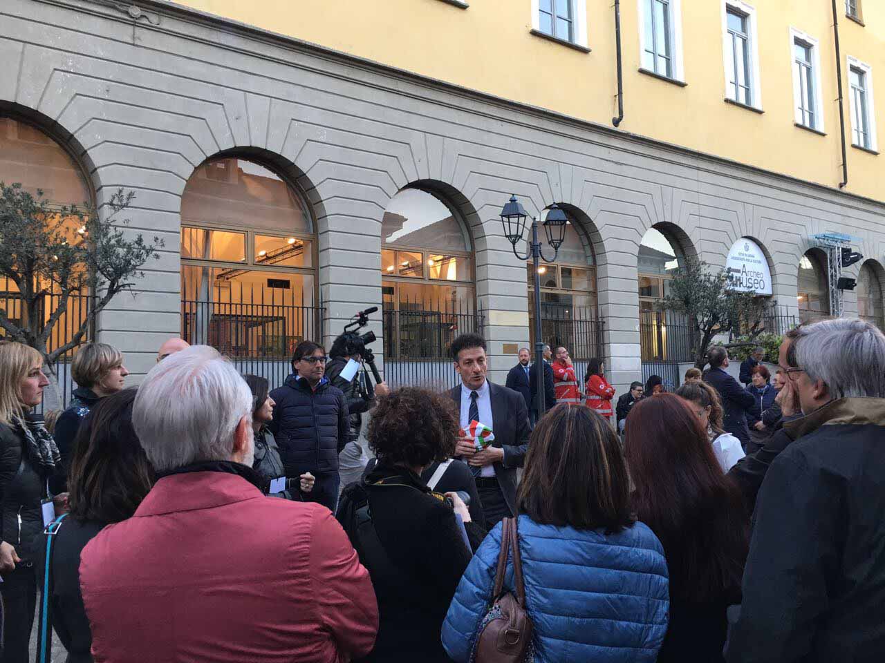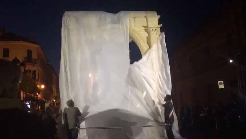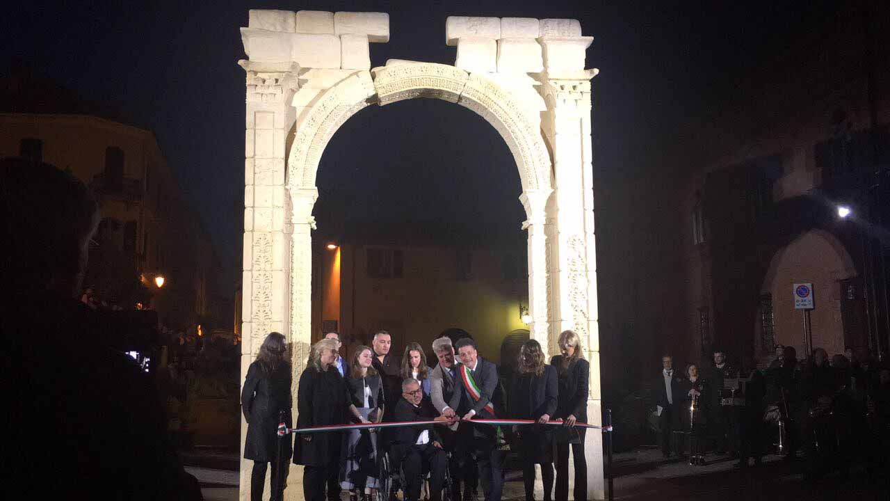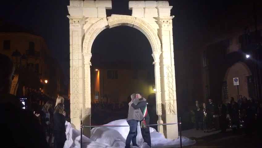 ARONA- 30-04-2017- Tanta emozione, e qualche lacrima di commozione in ricordo del sacrificio di Khaled al-Asaad, l'archeologo trucidato dall'Isis perchè rimasto per preservare il sito di Palmira, ad Arona sabato sera per l'applauditissima inaugurazione della ricostruzione tridimensionale dell'Arco di Palmira, che approda sul lago Maggiore dopo le prestigiose vetrine di New York, Londra, Dubai e Firenze, dove resterà per tre mesi. Sino alla fine di luglio ogni sera ci sarà uno spettacolo di luci e suoni: “E' un'iniziativa che nasce dell'intitolazione del nostro museo cittadino a Khaled al-Asaad- spiega il sindaco di Arona Alberto Gusmeroli- è stato un archeologo incredibile, ha dedicato la vita per preservare Palmira, rimanendo in città con l'invasione dell'Isis, rimanendo trucidato. Sono mesi che lavoriamo per questo momento importante, non solo per noi di Arona, ma per tutto il territorio. Vediamo come la civiltà, una cultura millenaria è più forte della barbarie. Avremo tutte le sere uno spettacolo musicale e di luci che abbraccerà la piazza e l'arco, avremo incontri e momenti di riflessioni, l'apertura del museo e la chiave di volta di Palmira. Tanti motivi per avvicinarsi ad un mondo importantissimo come quello della nostra storia, ma anche ad Arona ed al nostro museo. Un gemellaggio fra Arona e Palmira su cui abbiamo creduto guardando anche al futuro degli studi archelogici di Arona, oggi abbiamo annunciato che Politecnico di Milano ed Università Cattolica faranno con noi un progetto, mandando gli studenti a studiare la parte più alta della Rocca per fare sondaggi ed una campagna di scavi”.