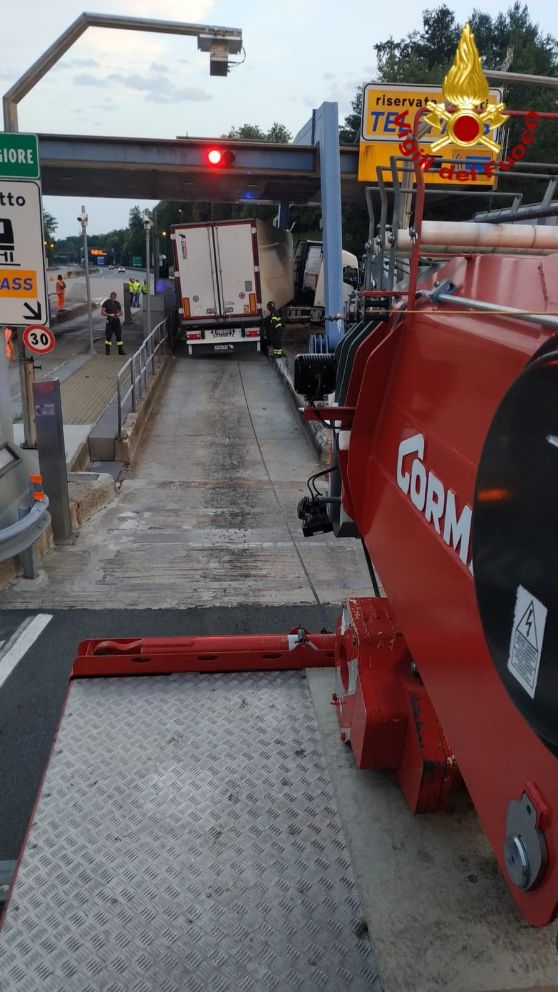L' autoarticolato ha effettuato un salto di corsia andandosi a incastrare nella struttura della barriera, frantumando tutte le infrastrutture elettroniche. Vi è stato un notevole spargimento di gasolio dai serbatoi che hanno subito danni. Illeso l'autista. Nessuna altra persona è stata coinvolta direttamente dall'evento. L'intervento si è concluso a tarda ora - I vigili del fuoco hanno messo l'area in sicurezza, staccando le batterie dell'automezzo e coadiuvando la società autostradale per cospargere assorbente per contenere la perdita del gasolio.