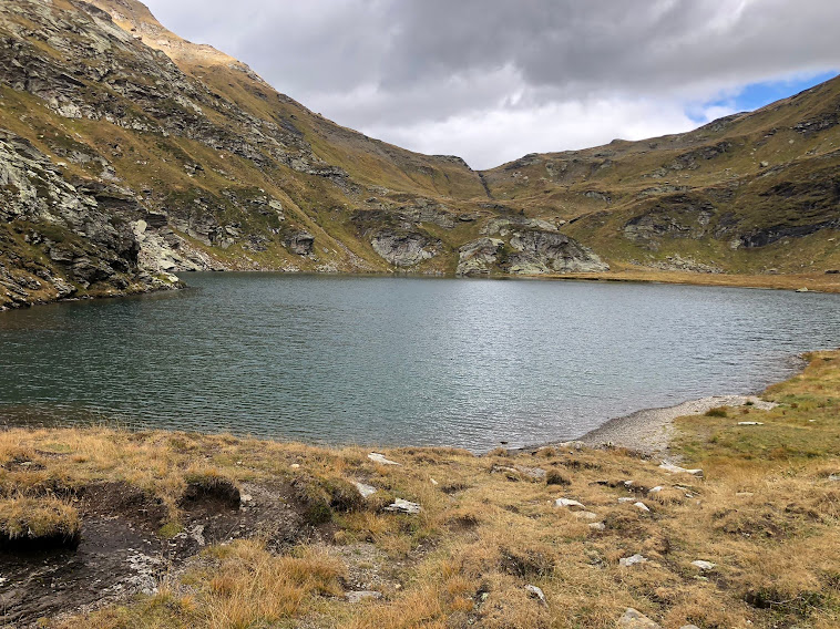 Al Lago di Poiala o Beyelesee, 2305, il sole ci abbandona e soffia un venticello fresco. I più freddolosi, dopo mesi di saune alpine, apprezzano nuovamente il piacere di camminare in montagna con giaccavento, guanti e berretto. Costeggiamo il meraviglioso specchio d’acqua e raggiungiamo il Passo, anche lui “di Poiala” o Hinnerlecka, 2411, Cima Coppi di oggi (un’ora e mezza).