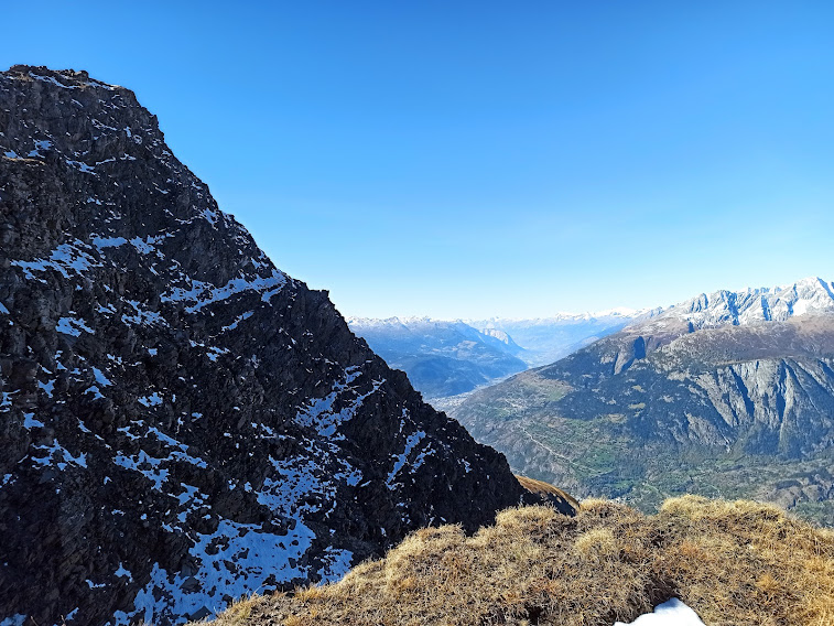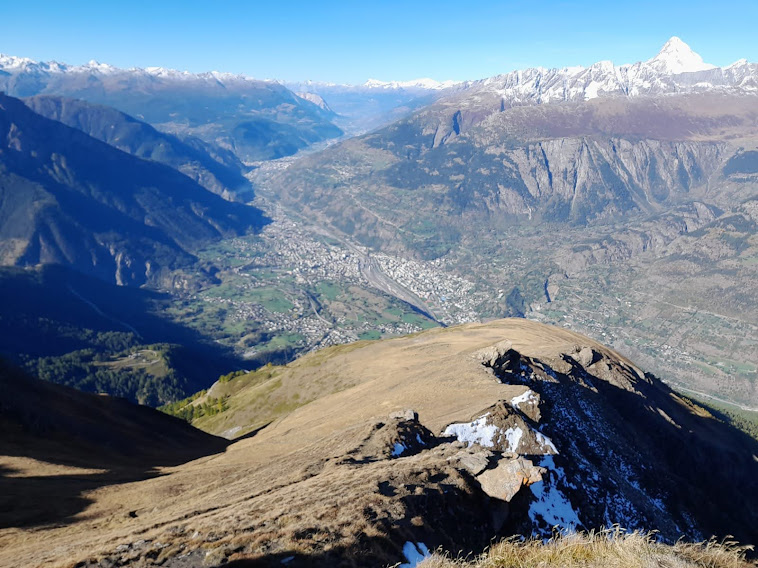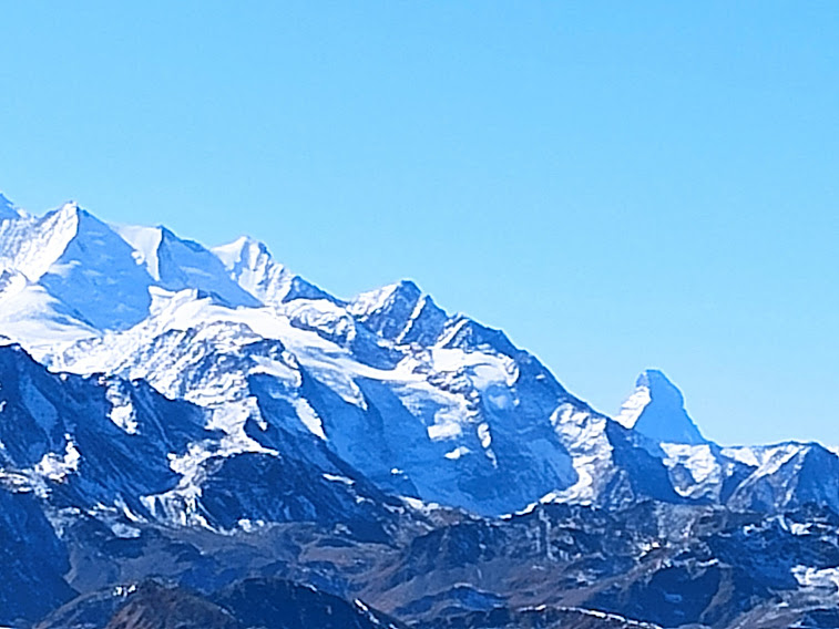 Dodici tornanti ci portano in vetta al Folluhorn, 2655, dopo poco più di due ore. Il panorama a 360 gradi è indescrivibile. Per ricordare solo le vette più importanti, passiamo da Finsteraarhorn a Aletschhorn, Nesthorn, Bietschhorn, poi Weisshorn, Matterhorn (Cervino per gli amici), i Mischabel, i quattromila del Sempione e tutto il resto, fino al Cervandone.