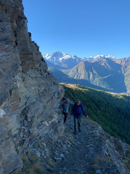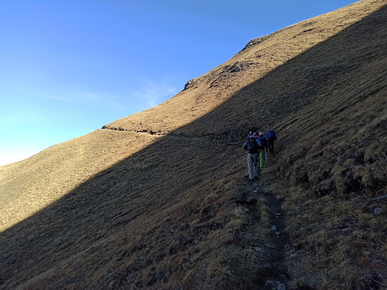 Siamo in ombra e anche la fresca temperatura ci aiuta. Occorre attenzione perché il sentiero è sì bello, ma “traversiamo” su terreno ripidissimo dove uscir di strada è tassativamente proibito. A quota 2300, a Kläna, cominciano finalmente a presentarsi alla nostra sinistra dolci pendii, che prendono il posto dei precipizi rivolti verso Briga. Ci raggiunge anche il sole e sostiamo brevemente. Qui la rotta s’inverte verso sud est, con sentiero e pendenza sempre ottimali.
