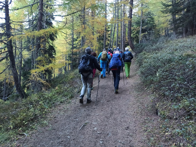 Ben mascherati, arriviamo puntuali a Briga, dove ci aspettano sette amici che ci accompagnano a Rosswald, 1821, in auto lungo la stretta stradina asfaltata che sale da Schallberg, sulla strada verso il Passo del Sempione. E’ una splendida giornata, ma il cuore è molto pesante perché nei giorni scorsi un carissimo amico, insostituibile, socio fondatore del gruppo dei Trotapian e compagno di centinaia di gite in montagna, ci ha lasciati. Gianni camminerà sempre con noi.