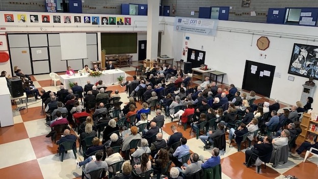 VARALLO POMBIA - 23-04-2023 -- Atrio della scuola secondaria di primo grado dell'IC "Andrea Camilleri" di Varallo Pombia gremito nel pomeriggio di sabato 22 aprile, per l'incontro sul tema della Costituzione con l'on. Fausto Bertinotti. L'appuntamento è stato organizzato, in vista delle celebrazioni per il 25 aprile dall'assessorato all'Istruzione guidato da Vania Tommasini. Il sindaco Joshua Carlomagno, introducendo l'appuntamento, ha affermato di "essere orgoglioso di ospitare l'incontro.