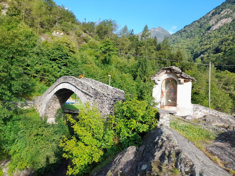 Splende il sole e ci sorride la grande Parete Est. Le previsioni, pessimistiche come sempre più spesso accade, fanno appesantire gli zaini con l’ombrello. Scendiamo verso l’Anza e, prima di attraversarla sul monumentale ponte romano, osserviamo con ammirazione un giardino popolato da sculture in legno di animali.