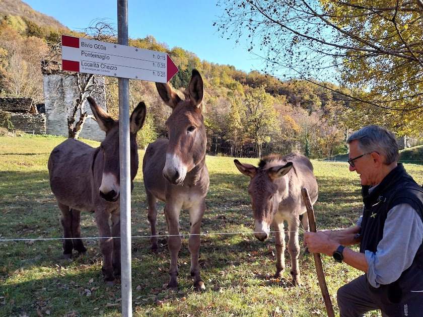 Con certa gente si sa sempre da dove si parte, ma mai dove si arriva. Più avanti incontriamo, sulla destra, il sentiero poco tracciato, ma adesso ben segnato, che anni fa ci aveva fatto un po’ tribolare. Lo seguiamo facilmente e scendiamo alla strada che da Lomese e Chezzo sale a Veglio. Ci accolgono quattro simpatici asinelli. Teniamo ancora la destra e la seguiamo, raggiungendo in pochi minuti Veglio.