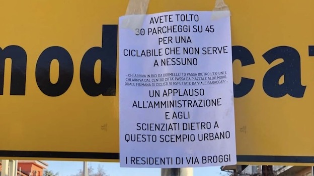 ARONA - 31-12-2023 -- Il regalo di Natale della pista ciclabile agli aronesi nella zona sud di Arona (Mercurago, via Cadorna, via Crosa, fino a Corso Europa) non è stato gradito, anzi è molto contestato. In una assemblea pubblica i residenti hanno manifestato le loro rimostranze e perplessità sia sulla sicurezza che sulla eliminazione di numerosi parcheggi. Alcuni hanno affermato che, per contestare, non andranno più a votare. L’ex assessore ai lavori pubblici Matteo Polo Fritz, che risiede in zona, ha presentato in Comune un esposto-diffida con cui ha chiesto di “demolire l’intera opera”.