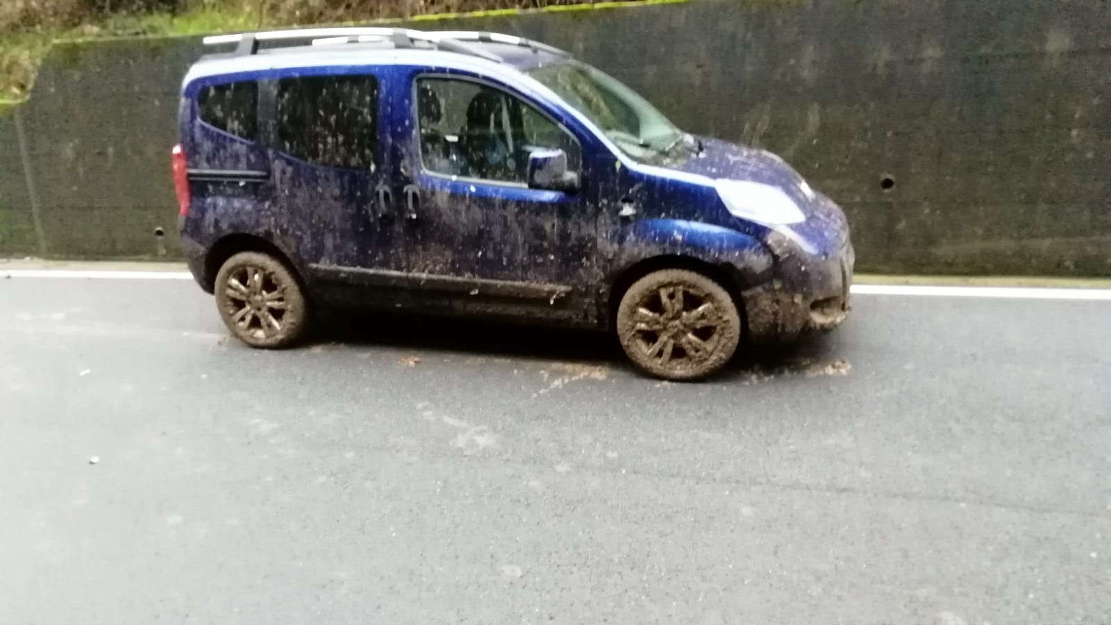 Nei pressi dello smottamento, un'auto sporca di fango.