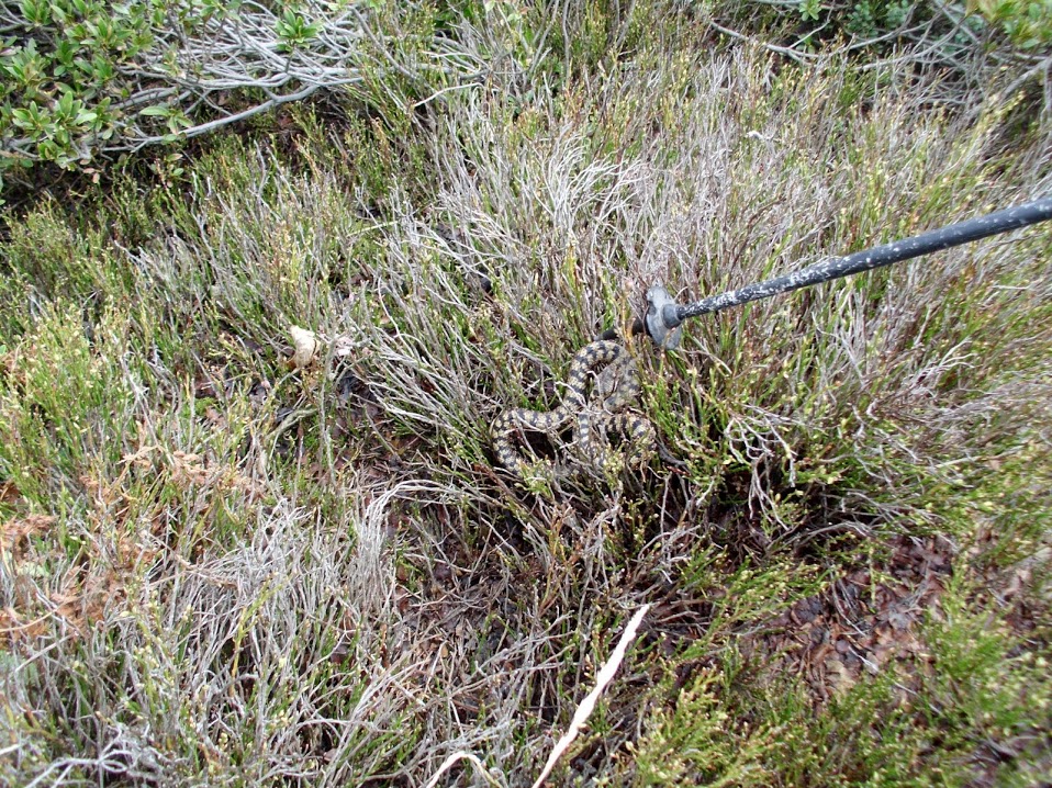 Da L'Agher alla cima si devono inserire le ridotte, la pendenza è inclemente. Dopo una “ripida” ora finisce anche il bosco e ci troviamo sulla dorsale est - ovest che porta in vetta. Fortunatamente non picchia il sole e il fresco allevia le nostre sofferenze. Una bella vipera si fa trovare in mezzo al sentiero, semi addormentata dopo il lungo letargo e priva di intenzioni bellicose. Ci limitiamo a spostarla delicatamente. Uccidere le vipere non serve a niente. Se non tenti di accarezzarle a mani nude o se non le calpesti a piedi scalzi, si fanno i fatti loro e svolgono la loro utile funzione nella catena biologica.