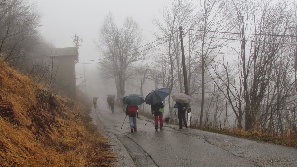 Rinunceremo all'ineguagliabile panorama che si gode dalla vetta, ma manterremo l'allenamento e trascorreremo una bella giornata fra amici. La montagna fra i due laghi si può raggiungere da ogni paese o città sita ai suoi piedi. Con la pioggia insistente di oggi riteniamo sia meglio prediligere il comodo percorso che sale da Levo, il bel paese a 600 metri che domina Stresa e Baveno. Siamo in dodici più l'impermeabile Willy, a quattro zampe.