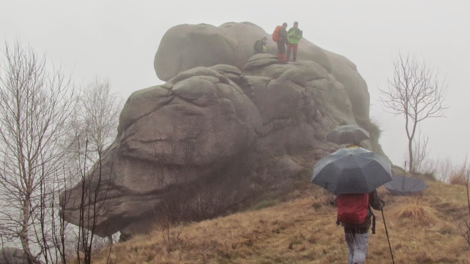 Panorama zero, pioggia sempre e velocemente scendiamo alla baita CAI, sul versante di Omegna, dove ci si asciuga e si pranza. Nella nebbia e sotto la pioggia ripartiamo in direzione nord — nord — est, scendendo lungo la pista di sci fino al caratteristico masso a forma di ippopotamo, che qualche ardito scala. Di qui si raggiungono l'Alpe Nuovo ed il rifugio del CAI Baveno, 1205, (quasi un'ora). Ancora una breve discesa e poi cinquanta metri di risalita fino al Monte Zughero, 1230 (un quarto d'ora). La pioggia dà un po' di tregua, ma il panorama è sempre assente. Si prende la direzione sud — est con un breve tratto di sentiero scomodo e ripido (l'unico dell'escursione).