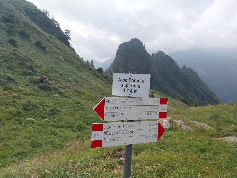 Complimenti a chi l’ha finanziato e a chi lo ha eseguito! Passiamo dall’Alpe Scispul, 1484, ancora nel bosco di conifere, e, usciti nei prati, proseguiamo fino all’Alpe Forcola Inferiore, 1681, dove sostiamo per una veloce colazione. C’è solo una baita diroccata. Fino a qui due ore di cammino. Superiamo l’Alpe Forcola, 1787, teniamo la sinistra aggirando un dosso e risaliamo l'ultimo pendio che ci porta all'Alpe Forcola Superiore, 1914, e, a pochi passi da lì, al Passo della Forcola, 1920 (mezz’ora).