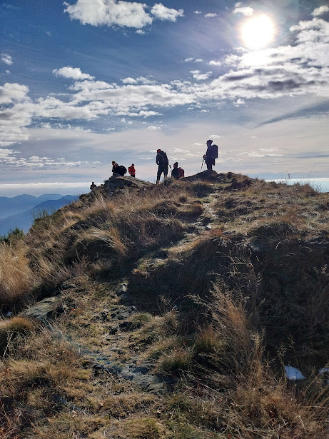 Il panorama, anche qui impagabile, merita una pausa fotografica ed il primo brindisi alla festeggiata, visto che un anziano esperto ossolano si è portato fin qui due stupende bottiglie di un pregiato vino francese. Questo è vero spirito di gruppo e attaccamento al dovere. Un evidente sentiero, privo però di qualsiasi cartello segnaletico sia qui che in basso (che sia una scelta?), una sorta di “direttissima”, ci riporta rapidamente sulla strada fra Piancavallo e Il Colle.