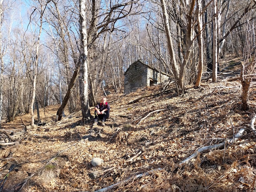 Sfioriamo l’Alpe Rombiago, 1167, dove invertiamo la rotta verso sud est. Qui si trova la Baita Zabò, che costituisce un ottimo punto d'appoggio e chi l'ha sistemata, in memoria di un amico, merita grande rispetto e tanta ammirazione. Non ci fermiamo qui, dove ci si potrebbe anche riparare in caso di maltempo, perché la giornata bellissima e la temperatura primaverile invitano a pranzare sullo splendido ripiano della vetta, 1301, che raggiungiamo in ordine sparso dopo un’ora da Biessen.
