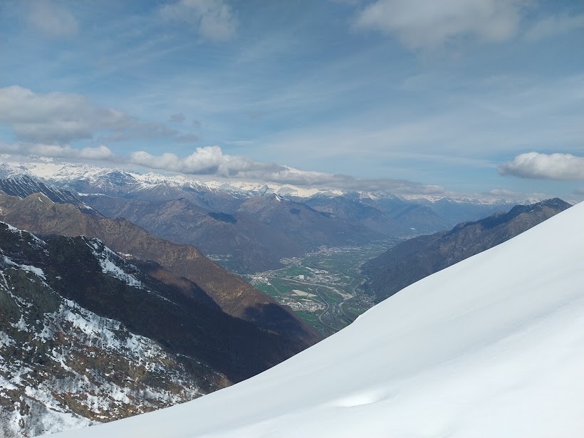 Accuserà la fatica solo all’arrivo, ma le cure delle badanti per ora lo galvanizzano. Attraversiamo belle faggete e incontriamo le prima tracce di neve intorno a quota 1500. Il sentiero per ora è evidente e “non molla” mai. Poco sotto l’Alpe Campo, anche per colpa della neve e della mancanza di segni, lo perdiamo e saliamo nei ripidi prati in ordine sparso fino ad arrivare all’altezza dell’Alpe alla nostra sinistra, 1739. Nel pianoro la diversa incidenza dei raggi solari ha lasciato molta neve, che evitiamo tenendoci più in alto, sul ripido pendio erboso che ci porta alla Colma di Pianello, sulla cresta fra Mazza dell’Inferno e Croce del Campo, fra Ossola e Strona, a quota 1780 circa (un’ora e un quarto). Panorama stupendo sull’Ossola e oltre, anche se qualche nuvola nasconde un po’ i Quattromila.