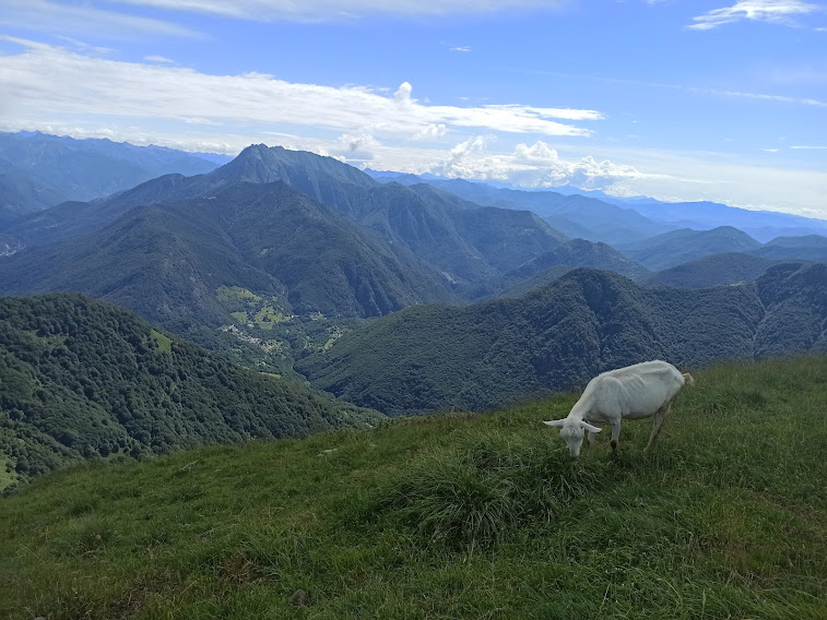 Questa piccola bocchetta collega Val Loana e Val Cannobina. I meno pigri salgono alla croce pochi metri più in alto. Da La Cima ci dirigiamo decisamente a sud lungo la dorsale che separa le due valli, in leggera discesa, e risaliamo alla Testa del Mater, 1846. Qui manca solo Heidi, ma di caprette ce ne sono proprio tante. Breve pausa. La gita tranquilla ci consente di rifiatare più del necessario. Sempre verso sud lungo la dorsale, sul sentiero/traccia comunque evidente, con dolci su e giù e attraversando ripidi pratoni, arriviamo alla Bocchetta della Forcola, 1685 (un’ora e tre quarti da La Cima). L’ultimo tratto del sentiero che scende qui è ripido ed impervio, da percorrere con attenzione.