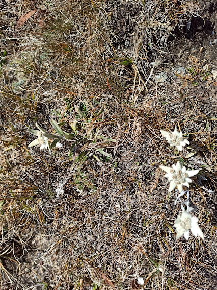 In discesa seguiamo il sentiero segnato G26, tenendoci a sinistra (più a nord) della “scorciatoia” di salita. In totale relax, al termine della vera fatica, fotografiamo bellissime stelle alpine e ci fermiamo, con vista su Toggia, Castel e Boden, per recuperare un po’ delle calorie bruciate oggi (mezz’ora).