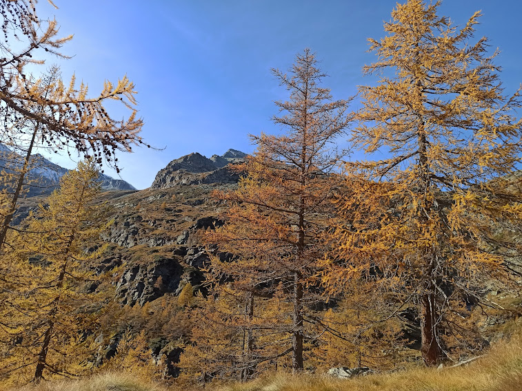 Ci ricompattiamo ed iniziamo la salita “seria”, diretti adesso a nord ovest, incontrando, poco più in alto, il caldo sole di questa magnifica giornata autunnale. Siamo immersi nel colore dorato di vecchi larici che il poeta della montagna Paolo Crosa Lenz chiama “signori dell’autunno”.
