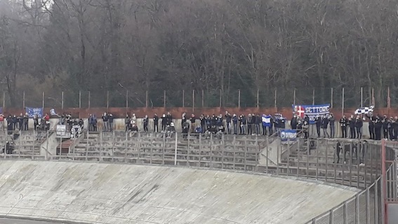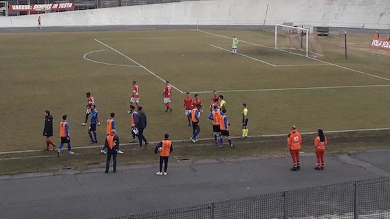 VARESE -06-02-2022 -- Gli azzurri escono dallo stadio sotto le urla della tribuna del Città di Varese che grida “ladri”, ma la squadra di Marchioni ipoteca il successo in campionato al termine di una gara non bella, ma combattuta e vinta con spirito utilitaristico.