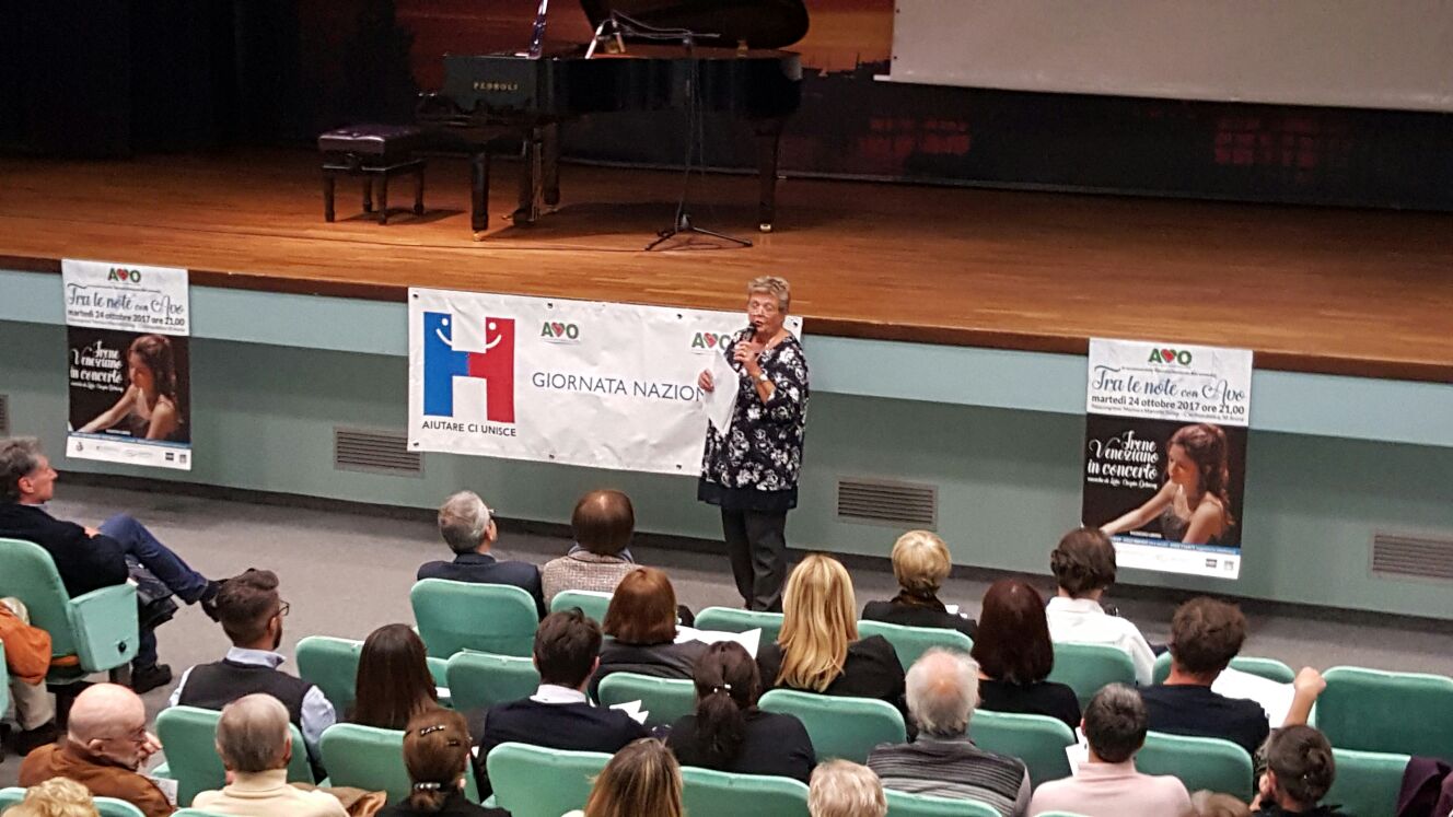 ospedalieri ha festeggiato la nona edizione della giornata nazionale Avo con un grande concerto per pianoforte martedì 24 ottobre al Pala congressi Salina, ospitando Irene Veneziano, giovane castellettese, musicista di fama internazionale. Una festa che ha riunito non solo i volontari Avo aronesi e di alcune altre sezioni vicine, ma anche un numeroso pubblico di simpatizzanti, amici e parenti oltre alle amministrazioni comunali di Arona e paesi limitrofi e alle direzioni sanitarie degli ospedali e case di riposo, dove l’associazione è presente.“La serata, a ingresso libero, è stata organizzata non per raccogliere fondi, bensì tempo: il tempo di persone di buona volontà che possano dedicare almeno tre ore settimanali al servizio degli ammalati e degli anziani – così Silvia Riva, presidente Avo Arona, nell’introdurre la serata - Cerchiamo volontari che si sentano di entrare a far parte della nostra associazione. È difficile spiegare a chi non ha mai avuto un’ esperienza di volontariato il suo significato profondo: diciamo che il volontariato può essere immaginato come una bella ciliegia che va assaggiata. Il mio invito è dunque quello di assaggiare il volontariato. Noi che lo abbiamo fatto non l’abbiamo più abbandonato”. Il sodalizio, che opera in città e sul territorio da oltre un trentennio è, infatti, alla costante ricerca di volontari che non solo prestino servizio nelle strutture in cui l’associazione è attiva, ma anche di persone che con la loro preparazione possano aiutare a entrare nel veloce e ineludibile mondo dei social (sito internet, facebook, instagram).“ Un ringraziamento di vero cuore a tutti i nostri volontari di Arona, in particolare coloro i quali si sono prestati per la buona riuscita della serata – ha aggiunto Riva dopo la presentazione del video promozionale realizzato da Avo Milano e proiettato durante l’intervallo - Questa serata è il frutto del lavoro e dell’impegno di tutti noi: Maurizio, Olga, Simona, Nilde, Anna, Graziella, Gabriella, Giovanna”. Durante la serata è stato distribuito anche materiale informativo sull’associazione. Per diventare volontario Avo è necessario seguire un corso gratuito di formazione, anticamera del tirocinio nei centri di servizio, che come d’abitudine si svolgerà in primavera. Una decina le lezioni serali introdurranno a un colloquio finale dopo il quale gli aspiranti volontari saranno ammessi al tirocinio affiancati inizialmente da un tutor. Per informazioni e iscrizioni al corso: 339.4304819 – Questo indirizzo email è protetto dagli spambots. È necessario abilitare JavaScript per vederlo. . (A.M.)