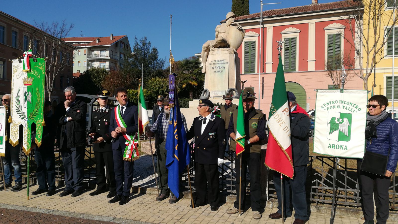 al monumento ai Caduti in piazza De Filippi, la cerimonia di commemorazione dell'anniversario della vittoria italiana nella Prima Guerra Mondiale ed il Giorno dell'Unità Nazionale e Giornata delle Forze Armate. Dopo la deposizione delle corone di alloro da parte dell'amministrazione, i partecipanti si sono spostati nella palestra dell’Istituto Comprensivo “Giovanni XXIII” per un saluto del dirigente scolastico, dr.ssa Gabriella Rech e gli interventi del sindaco di Arona, Alberto Gusmeroli, e di un insegnante. Il coro dell’Istituto Comprensivo “Giovanni XXIII” dedicherà un momento musicale.