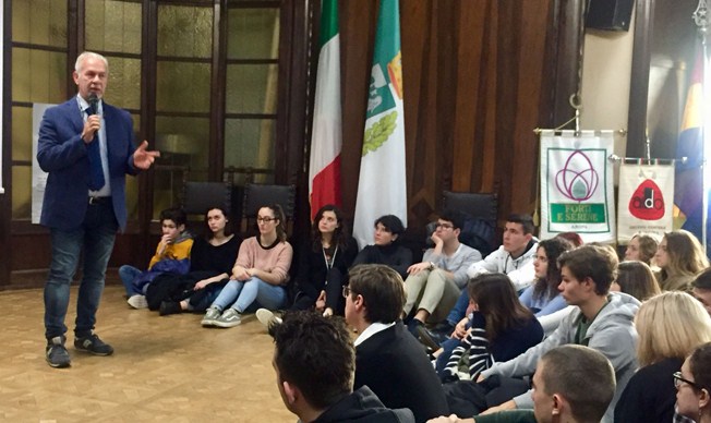 venerdì 9 febbraio, la commemorazione del "Giorno del Ricordo", per non dimenticare la tragedia delle Foibe. Dopo una riflessione con le autorità nell'area antistante il Comune, nell'aula magna, si è svolto l'incontro con Claudio Strozzi, figlio di esuli istriani. Durante l'incontro, al quale ha portato la propria testimonianza Strozzi ha parlato a circa 150 studenti del Liceo Fermi e dell'Enaip che hanno affollato l'aula.