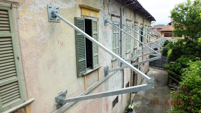 Così lo spiega l’ing. Gattone: “Sono state realizzate alcune strutture, in carpenteria metallica zincata, necessarie per l’istallazione di reti metalliche deformabili e funi metalliche in grado di assorbire e contenere la forza di impatto provocata da un eventuale crollo della copertura e dei rivestimenti in pietra delle finestre del primo piano della Casa Papa Giovanni. E’ stato necessario progettare un sistema di protezione non rigido e con un’elevata capacità di potersi deformare, in questo modo -prosegue Gattone- la forza di impatto, provocata dalla caduta della copertura sulle reti metalliche, sarà limitata e trasferibile alle strutture in carpenteria metallica e alle murature dell’edificio esistente. La posizione delle reti di protezione dovrà permettere di intercettare l’eventuale crollo della gronda di copertura del tetto della Casa Papa Giovanni e dei rivestimenti, dei davanzali e delle cornici in pietra delle finestre esistenti al primo piano. Per tali ragioni tale posizione è stata prevista al di sotto delle finestre del piano primo dell’edificio”.