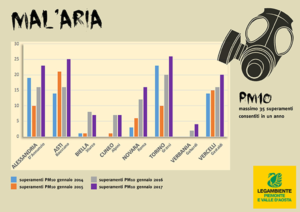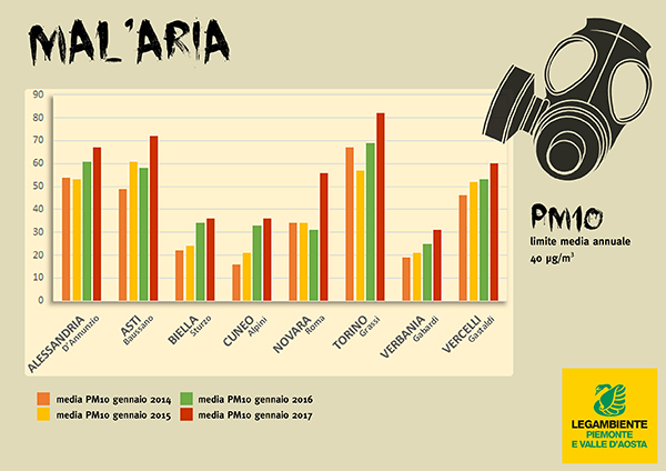 PIEMONTE-10-2-2017- “Smog, il peggior inizio anno dal 2014. Legambiente: “Il blocco dei diesel Euro3 è solo il primo passo non più rinviabile” A gennaio Torino e i principali capoluoghi piemontesi hanno già consumato più di due terzi del “bonus annuale” dei 35 giorni previsto per le PM10.” Così il comunicato diffuso oggi da Legambiente, che prosegue: “I dati di inizio 2017 non lasciano spazio ad interpretazioni: siamo di fronte ai peggiori livelli di smog degli ultimi 4 anni. Le famigerate polveri sottili e ultra sottili, PM10 e PM2.5, hanno raggiunto nei capoluoghi piemontesi valori non solo oltre i limiti di legge ma superiori anche di due o tre volte. E’ il caso di Torino, Asti, Alessandria, Vercelli e Novara, ma anche delle tradizionalmente meno critiche Cuneo, Biella e Verbania dove i valori hanno segnato comunque un’inversione di tendenza negativa.